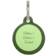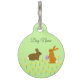 Dit geweldige hondenlabel bevat een paar schattige paasbunnies omgeven door gele daffodilbloemen. De konijnen zijn bruin met grote oren, zwarte ogen en vloeiend witte staarten. Een van de bunnies houdt een paasei met een paarse boog erop vast en reikt het uit om het aan de andere bunny aan te bieden. De daffodils zijn geel met een helder oranje midden.