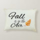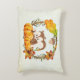 Voorkant van het kussen met een schattige eekhoorn die achter een aantal oranje waterverf pompoenen staat. Een bloemenkrans omringt hen met een eikenblad en oranje bloemen en andere takken en bladeren. De achterkant van het kussen heeft een typografisch ontwerp dat zegt dat Herfst in de lucht is. Achtergrond achter het afbeelding is een faux perkament afbeelding in een crèmekleur, met een ruw verouderde look rond de randen.