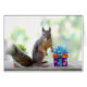 Een eekhoorn stelt zich tussen twee cadeaus met een brij in deze originele foto.