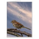 Een afbeelding van een klein bruin vogeltje ( mus of chickadee ) zittend op een zelfgemaakte stoel opgebouwd uit boomtakken die op ons dek staat. De lucht achter de vogel is blauw met witte wolken.