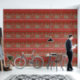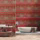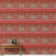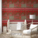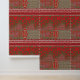 Een kruissteek patroon met rode bloemen en wijnsto behang