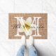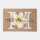 Een mooie natuur-zomerontwerpfloraal op een boezemdoormat. Een mooi design voelt heel natuurlijk. Achtergrond is een afbeelding van bocht en een witte gele florale. Groot elegant initiaal monogram M in witte en manuscript zwarte tekst. Een schattige, monogrammaticale inbreker.