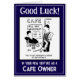 In je nieuwe onderneming als caféhouder. Cafe cartoon. Cafe-eigenaar vertelt een klant die de hele dag een ontbijt eet dat hij niet de hele dag moet eten. Personaliseer met uw keuze van de formulering en inside bericht. Succes voor een café eigenaar.