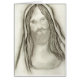 Een eenvoudige zwarte en witte potloodschets van een plechtige blik op Jezus in een sonde
