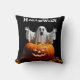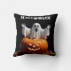 Een vrolijke geest in wit zweeft boven een griezelige gesneden pompoen, omringd door herfstbladeren, die de geest van Halloween-festiviteiten 's nachts oproepen.