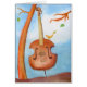 Waterverf illustratie. Op een prachtige dag met een blauwe hemel en witte wolken lijkt een kleine vogel op een cello te praten met een doolblad. Dit is het perfecte cadeau voor niet alleen kinderen, maar ook volwassenen. U kunt het met uw eigen tekst aanpassen.