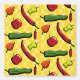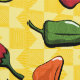 Een peri-peri, friggitello, habanero, rocoto, jwala en shishito chili pepper zijn versierd met patronen uit het gebied waar ze oorspronkelijk werden geteeld of vaak worden gegeten en zitten op een gele achtergrond met patronen die geïnspireerd zijn op tattoos die door inheemse volken in het Amazonegebied worden gedragen om een leuk herhalingspatroon te creëer dat de oorsprong en verspreiding van deze lekkere smaak weerspiegelt, en vaak fruitig haar.