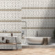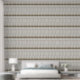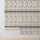 Dit ontwerp toont een herhalend patroon met een beige kleurenschema. Het patroon bestaat uit verschillende abstracte vormen en lijnen gerangschikt in rijen. Het algehele ontwerp heeft een symmetrische lay-out, met gespiegelde elementen die een visueel interessant effect creëren. Het patroon heeft een ingewikkelde en gestructureerde uitstraling, wat bijdraagt aan de algehele esthetische aantrekkingskracht.