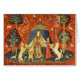 De Lady en de eenhoorn, een middeleeuwse tapijten uit ongeveer 1500, is een van een set Franse tapisserieën, beschouwd als geweldige kunstwerken uit de middeleeuwen. Deze dame en de tapijt van de Unicorn zijn een verbluffend afbeelding van een dame die in een tent staat, met een eenhoorn aan één kant van haar, en een leeuw aan de andere kant. Er zit een witte hond op een bank naast haar, en een handmeisje aan de andere kant. De achtergrond van de tapestry is een rood veld van bloemen en dieren, waaronder honden, konijnen en vogels. De oorspronkelijke medievale Unicorn tapestry was behoorlijk beschadigd en verloor veel van zijn oorspronkelijke heldere kleuren en kwaliteit. Terwijl we in staat waren om een deel van de oorspronkelijke rode en blauwe middeleeuwse kleur van de Unicorn tapestry te herstellen, wees u er alstublieft op dat er nog steeds onvolkomenheden in het afbeelding zijn. De onze is echter een unieke versie van deze middeleeuwse tapijten, omdat we ze hebben uitgebreid en verbeterd om de oorspronkelijke schoonheid ervan te laten zien.
