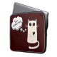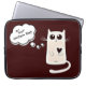 Een neopreen laptophoes met schattige cartoon van een droevig kat dat een hart vasthoudt met een denkbubbel "werk of spel".