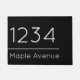 Deze zwarte deurmat heeft witte tekst die u kunt bewerken om uw straatadres te shows. Cijfers voor uw huisnummer staan boven een horizontale lijn en tekst voor uw straatnaam.