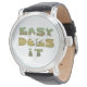 Gemakkelijk doet het, een vet lettertype met groen en geel verloop. Rustig aan. Een opbeurende gezegde om u eraan te herinneren om te ontspannen. Een slogan die wordt gebruikt door het heroveren van alcoholisten en verslaafden in 12-stappenprogramma's zoals Alcoholics Anonymous, Narcotics Anonymous en Al Anon.