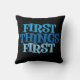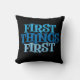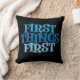 First Things First is een populair gezegde in herstelkringen. Dit leuke, eigentijdse ontwerp is groot, blauw en vet en gedrukt op een zwarte achtergrond. Het ontwerp is aan beide zijden van het kussen hetzelfde.