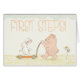 Een baby die zijn eerste stappen zet is een speciale mijlpaal om te vieren! Een schattig beer duwt een konijn die op een wagen rijdt. Ideale kaart voor een kleine jongen of een meisje.