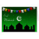 Eid Mubarak begroet afbeelding met een feestelijke en kleurrijke tuin in een magische nachtelijke scène met een moskee silhouette en de maan en sterren op een groene nachtelijke hemel.