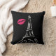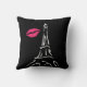 Heldere roze lippen, accentueren deze stijlvolle schets van de Eiffeltoren op dit zwarte kussen.
