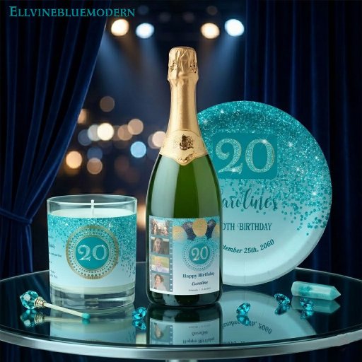 The sparkling Teal Blue Glitter wrapping paper, also features a unique Gold and Teal Blue Glitter, number 20, displayed on a modern plain circle, forming a charming wheel with Teal Blue dots and lines. Glitter Stripes with Teal Blue colors add a finishing touch to the celebration of her Twentieth Birthday.