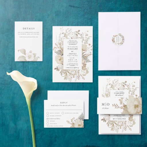 Elegant aardeachtig bloemig wit bruiloft RSVP