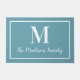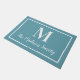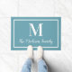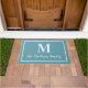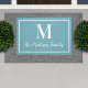 Freshen up your home's entrance with this elegant custom monogram doormat in aqua / teal blue and white colors. Note, colors can be modified. Personalize with your family's last name in script and a serif style monogram initial. Design includes a simple framed border.