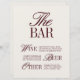 Maak uw receptie compleet met dit elegante minimalistische barbord, ontworpen om uw gasten met stijl te begeleiden. Met een schone ivoren achtergrond met verfijnde serif- en scripttypografie in de diepe bordeaux, geeft dit bord uw selectie van wijn, bier en drank op een tijdloze en verfijnde manier weer. Perfect voor moderne bruiloften, wijngaardrecepties, herfstfeesten of formele avondceremonies, het brengt zowel praktische als elegantie in uw baropstelling. Coördineert naadloos met de volledige "Sabrina" bruiloft briefpapier suite voor een samenhangende look.