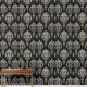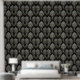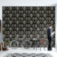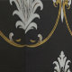 Een luxueus en damast patroon met ingewikkelde witte en gouden bloemmotieven op een zwarte achtergrond. Het ontwerp straalt een klassieke en verfijnde esthetiek uit, die vaak wordt aangetroffen in behang, textiel en hoogwaardige inrichting.