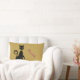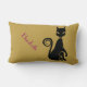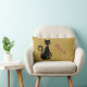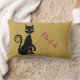 Elegante zwarte kat die poetst met één opgezette poot. Heeft een schattige krulstaart en draagt een fancy kakker. De naam op kussen is klantgericht aan om het even welke tekst u wilt, of het kan volledig worden verwijderd.