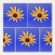 Het ontwerp toont een close-upfoto van een zongeelzwarte marginaal op een blauw vierkant betegeld patroon. Voor speciale verzoeken of vragen kunt u contact opnemen met de artiest via wafadahdalcreates@gmail.com. © Wafa Y. Dahdal - Alle rechten voorbehouden. WD Art