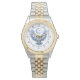This unique and mystical watch features a blue owl with outstretched, pattern image wings. His penetrating eyes look straight ahead and claws are outstretched. In the distance, behind and above him, is a crescent mood and silvery blue stars. Dark blue numbers make the watch easy to read, and a thin matching blue circle frame separates the inside bird and moon images from the numbers on the circular border. Everything stands out on a crisp white background.