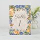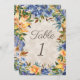 Elegant en romantisch blauw en oranje waterverf floral herfst/herfstbruiloft receptie 5"x7" tabelnummer, gedrukt op de voor- en achterkant. Ontwerp één voor elke lijst. Neem contact met mij op voor hulp bij uw aanpassingen of voor aanvullende matching of coördinatie van Zazzle-producten voor uw douche of andere trouwevenementen.