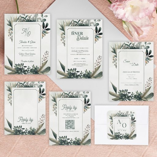 Designed with muted green tones and organic botanical elements, this invitation offers a refined and romantic look ideal for nature-inspired celebrations and modern classic wedding styles.