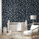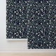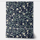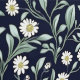 Dit naadloze bloemmotief heeft delicate witte madeliefjes met zacht gele centra, omgeven door bleke groene bladeren en kleine toppen, allemaal tegen een diep marineblauwe achtergrond geïnspireerd door William Morris. Het ontwerp straalt een klassieke, tijdloze elegantie uit die perfect is voor behang, textiel en briefpapier. Het contrast tussen de levendige bloemen en de donkere achtergrond creëer is een verfijnde en kalmerende esthetiek.
