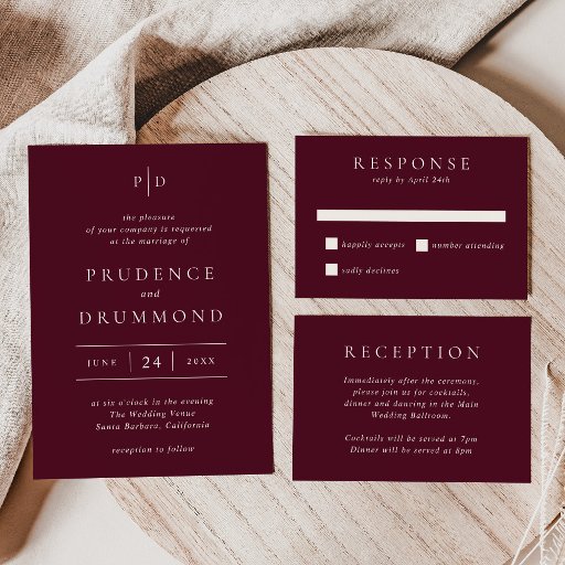 Classic style acrylic wedding invitation featuring a simple yet elegant design in a deep burgundy color that is perfect for a fall wedding or a winter / Christmas wedding.