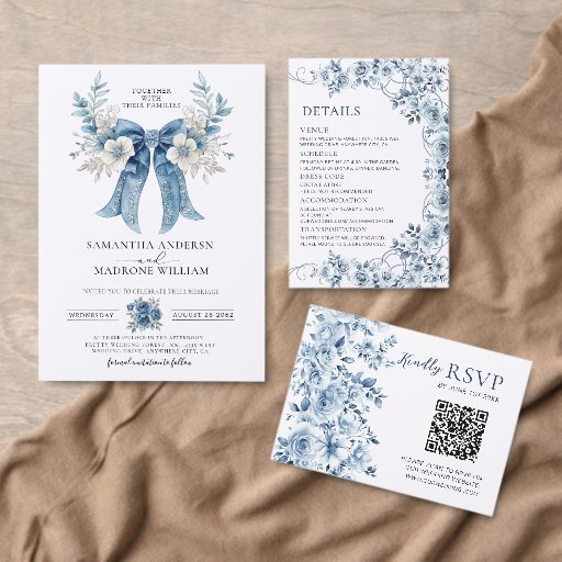 Elegant Dusty Blue Roses Bow Wedding Menu