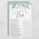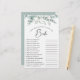 Elegant vrijgezellenfeest "hoe goed ken je het bruidspelletje" met sage groene eucalyptus greenery waterverven en "Bride" in een stijlvol script. Pas de vragen over de bruid-aan-moet-zijn aan en voeg haar naam en douchedatum op de rug toe.