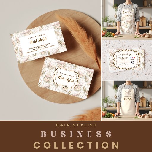 This elegant design features a soft vintage floral pattern paired with a refined ornamental frame, creating a timeless and feminine aesthetic. Delicate blush roses, subtle greenery, and classic botanical details give the design a romantic, boutique-inspired look that feels both professional and stylish. The soft neutral palette and elegant typography make it perfect for hair stylists, salon owners, and beauty professionals who want a polished and memorable brand presence. Ideal for modern salons with a feminine, luxury, or vintage-inspired identity.