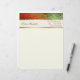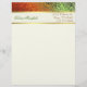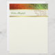 Lang en professioneel uitziend briefhoofd, gemaakt in crème, met grafische weergave van een gradiënt, groen tot oranje gekleurde folie, bovenaan. Een crèmekleurige streep met gouden toonranden zit onder de decoratieve top van de folie. Groene en bruine tekst, op de streep, is klaar om voor zich of uw zaken te personaliseren.