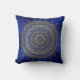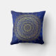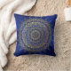 Een prachtig vormig bloemig mandala-ontwerp in lichtgoud op een diepe blauwe achtergrond, geïnspireerd door mehndi-henna lichaamskunst. Deze meditatieve kunstontwerpkussen maken een prachtig accent voor je thuisdecor