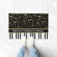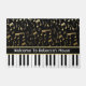 Een elegante stijlvolle welkomstmat met een ontwerp voor de pianist of muzikant met goudkleurige muzieknoten en een pianoklavier op een zwarte achtergrond met een gouden en zwarte strip om de naam van uw keuze toe te voegen aan creëer een uniek gepersonaliseerd muziekthema cadeau voor elke gelegenheid