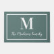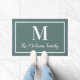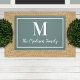 Freshen up your home's entrance with this elegant custom monogram doormat in gray teal blue / green and white colors. Note, colors can be modified. Personalize with your family's last name in script and a serif style monogram initial. Design includes a simple framed border.