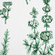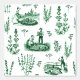 Classy illustraties van Victoriaans tijdperk mensen werken in de tuin en botanische illustraties van kruiden planten: basilicum, tijm, rozemarijn, borage, marjolein, salie, lavendel in salie groene tinten voor stijlvolle landhuis boerderij Boho home decor.