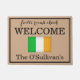 De vlag is een vette en mooie groene, witte en oranje vlag. De naam van een voorbeeldfamilie wordt dicht bij de onderkant afgedrukt. U kunt dit model personaliseren en uw eigen familienaam, bedrijfsnaam, of douanebericht of citaat toevoegen. De mat is voorzien van een zwarte gedrukte rand.
