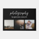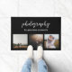 Moderne deurmat met een eenvoudig en minimaal ontwerp met uw bedrijfsnaam in een combinatie van een serif lettertype en een elegant script, samen met een fotocollage van drie van uw favoriete afbeeldingen op een zwarte achtergrond. Deze aangepaste deurmat is perfect voor een huwelijksfotografie.