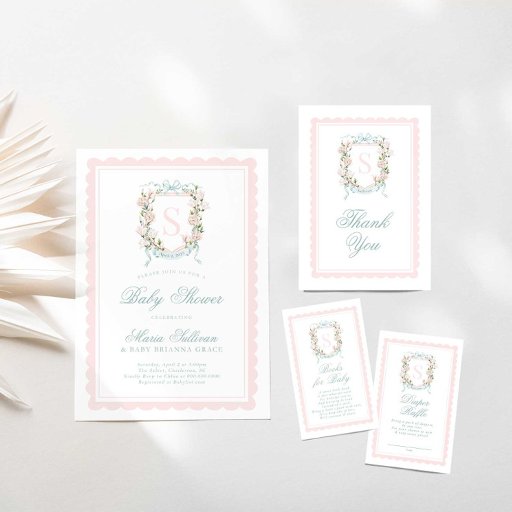 Pink Bow Monogram Floral Crest Baby ShowerOntworpen door Britt at Helia Design Co.