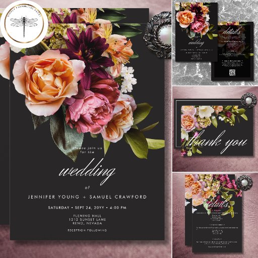 Vier liefde in tijdloze elegantie. Onze boeiende bruiloft bewaart de datumkaart met een verfijnde zwarte achtergrond, het perfecte palet voor een boeiend boeket. Stel je een hoekarrangement voor van blush roze, bordeaux en romige witte realistische bloemen met donker olijfgroen gebladerte, waardoor een gevoel van stille weelde ontstaat. Dit betoverende ontwerp zet het podium voor een intieme bijeenkomst vol hartverwarmende momenten en gekoesterde herinneringen. Creëer door Simply Farmhouse Press.