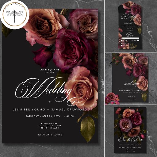 Omarm tijdloze elegantie voor uw gothic-geïnspireerde viering met onze boeiende bruiloft uitnodiging. Een zachte zwarte achtergrond zorgt voor het perfecte canvas voor een boeiend, maar ingetogen boeket. Stel je een hoekopstelling van gedempt roos voor, waar zachte roest blos en rijke bordeauxrode tinten zich vermengen met donkergroen blad. Dit etherische ontwerp straalt rustige verfijning uit, perfect voor het paar dat op zoek is naar een vleugje romantische duisternis. Uw trouwdetails worden in een modern lettertype getoond, zodat ze mooi opvallen. Dit betoverende ontwerp creëer is een echt onvergetelijke uitnodiging voor uw speciale dag, het zetten van de toon voor een humeurige en elegante viering van liefde. Creëer door Simply Farmhouse Press.