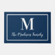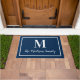 Verenig de ingang van je huis met dit elegante aangepaste monogram doormat in klassieke marineblauw en witte kleuren. De kleuren kunnen worden gewijzigd. Personaliseer met de familienaam in manuscript en een initiaal van het serif stijlmonogram. Het ontwerp omvat een eenvoudig omkaderde grens.
