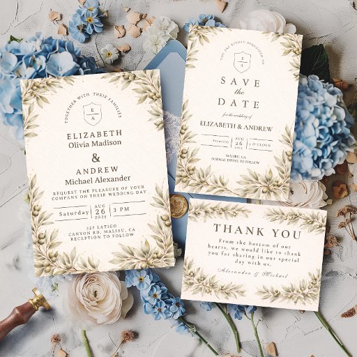 A timeless and refined design featuring delicate olive branches arranged in a soft botanical frame. The muted green tones and warm neutral background create a calm, elegant aesthetic inspired by Mediterranean landscapes and natural simplicity. Perfect for minimalist, garden, or destination weddings, this design offers a sophisticated and organic feel that remains effortlessly classic and versatile across seasons.