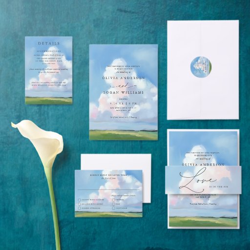 This elegant wedding backdrop features a beautiful painted landscape background with blue sky, white clouds, a green field, and elegant typography. It's the perfect design for a rustic yet elegant spring or summer wedding. See the collection for coordinating items.
