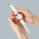 Dit elegante dameshorloge heeft een witte lederen band en rozen gouden metalen accenten. Klassiek en tijdloos design voor haar.