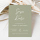 Our elegant, simple sage green Save The Date Wedding invitation card with white calligraphy script is perfect for your stylish wedding celebration. A beautiful pairing of white calligraphy font with simple and clean text on a soft green background makes for an elevated look to complement your special day. Easy to customize yourself with your own names and wedding event details.